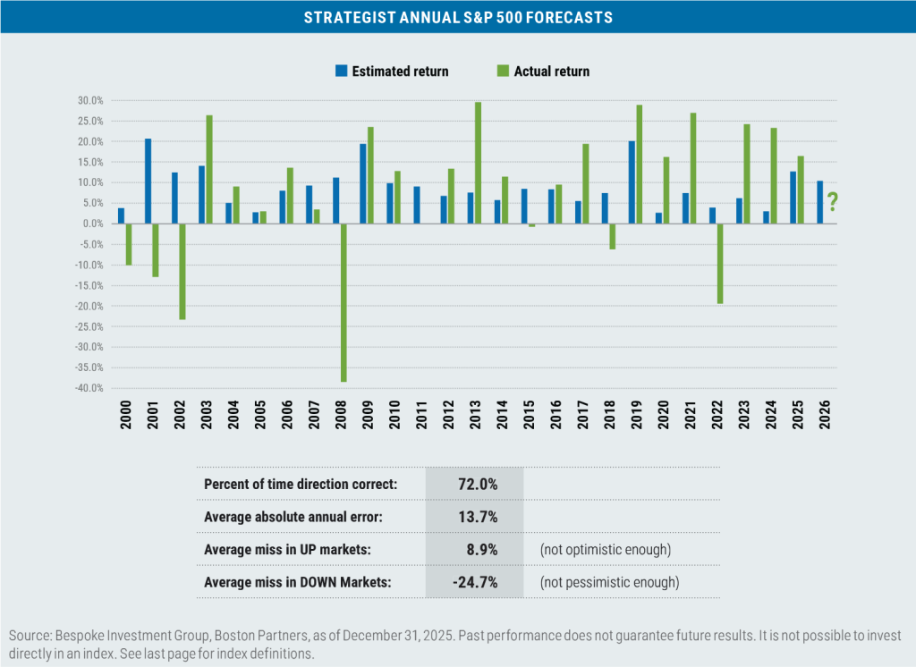 Perhaps these forecasts should be taken with a grain of salt, especially for the S&P 500: While the batting average of the strategists getting the direction of the return of the S&P 500 is respectable at 72% over the past quarter century, the magnitude of the forecasts’ misses leaves something to be desired.
