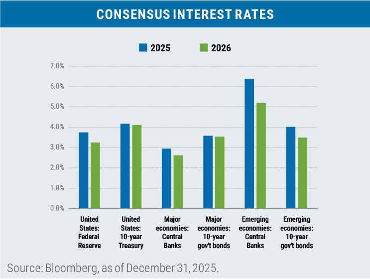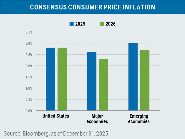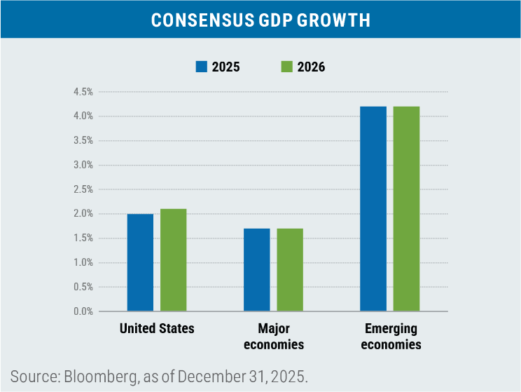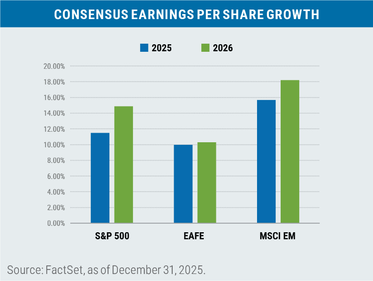 The primary factors that drove global returns in 2025 remain largely in place entering 2026: positive GDP and earnings growth paired with relatively low inflation and interest rates.
