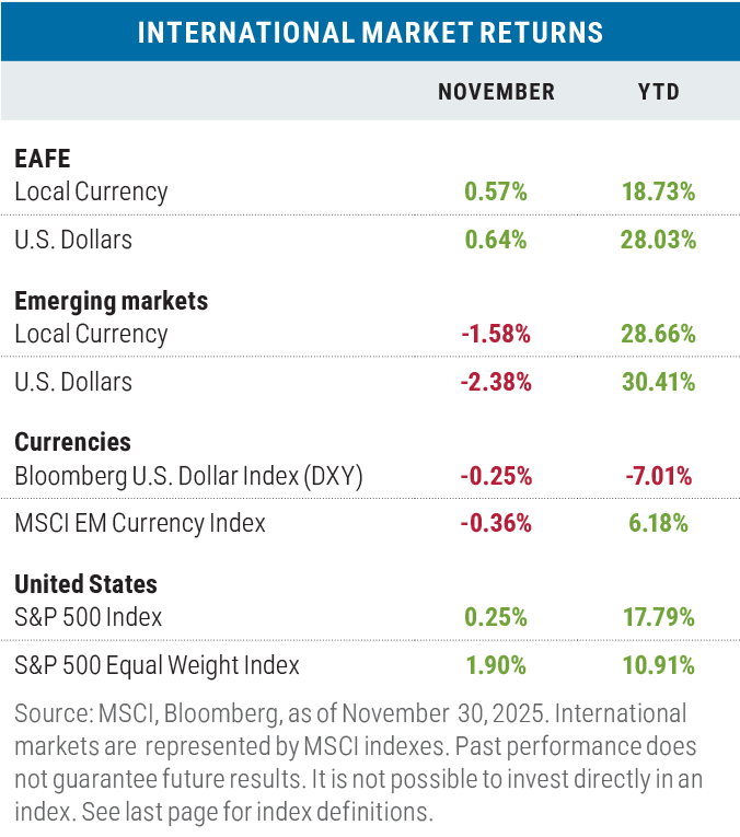 The EAFE Index of developed market international stocks slightly outperformed the S&P 500 in November in both local currency and U.S. dollar (USD) terms, but in keeping with the risk off theme that was prevalent during the month, emerging market stocks lagged U.S. equities—more so in dollar terms given the weakness in emerging market currencies. OPEC countries were particularly hard hit (Saudi Arabia, for example, was down 8.35% in USD) as the price of crude oil fell from $65.07 per barrel to $63.20 during the month on oversupply concerns.