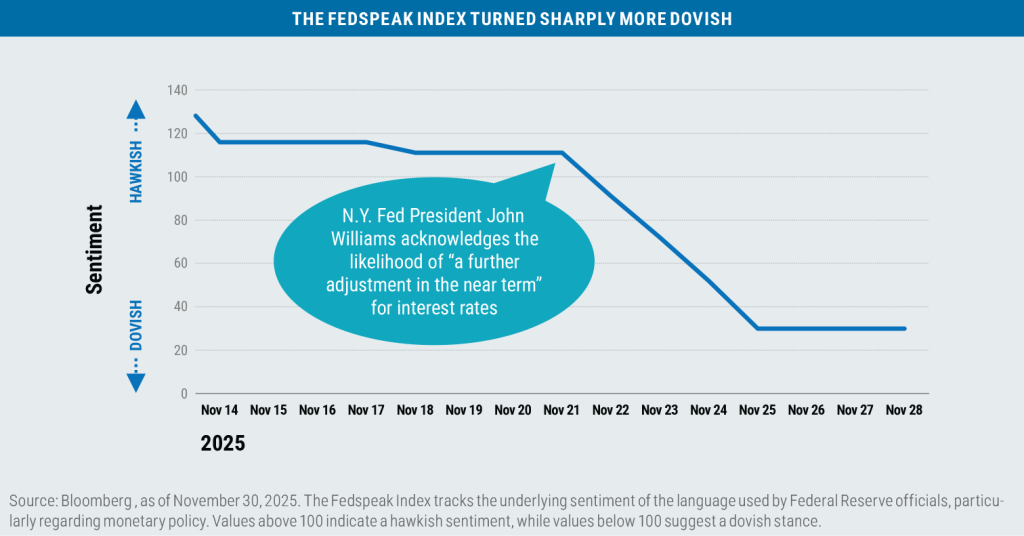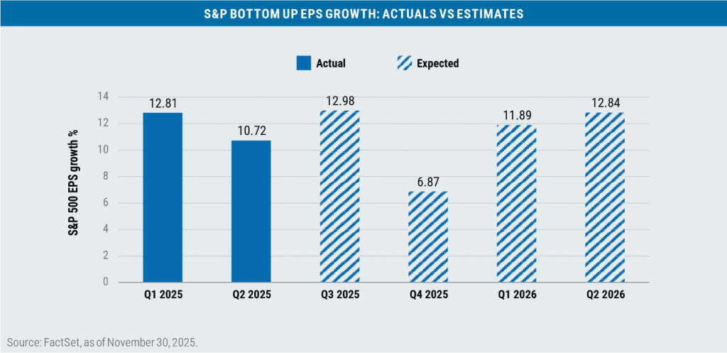 The AI “arms race” refers to the accelerated pace of capital expenditures currently under way among AI providers and other large technology companies. A basis point refers to a common unit of measure for interest rates and other percentages in finance. One basis point is equal to 1/100th of 1%, or 0.01%. Beta is a measure of a portfolio’s market risk relative to its benchmark. In general, a beta higher than 1.00 indicates a more volatile portfolio and beta lower than 1.00 indicates a less volatile portfolio in relation to its benchmark. The Bloomberg U.S. Aggregate Bond Index tracks the performance of intermediate-term investment-grade bonds traded in the United States. The Bloomberg U.S. Dollar Index (DXY) is used to measure the value of the dollar against a basket of six foreign currencies. The value of the index is a fair indication of the dollar’s value in global markets. Comments from the Federal Reserve classified as either dovish or hawkish refers to the underlying stance on monetary policy: A dovish policy prefers lower interest rates to stimulate the economy, while a hawkish policy prefers higher rates to tamp down inflation and/or slow a potentially overheating economy. Earnings per share (EPS) reflects a company’s total earnings divided by the total number of shares outstanding. Blended EPS combines historical (i.e., actual) earnings with earnings expectations and is often used to assess a group of companies that may be in different stages of their earnings reporting cycle. The MSCI Emerging Markets (EM) Currency Index tracks the performance of emerging market currencies relative to the U.S. dollar where the weight of each currency is equal to its country weight in the MSCI Emerging Markets Index. The MSCI EAFE Index tracks the performance of large- and mid-cap equities traded across global developed markets, excluding the United States and Canada. The MSCI Emerging Markets Index tracks the performance of large- and mid-cap equities traded in global emerging markets. The Organization of the Petroleum Exporting Countries (OPEC) is an alliance of 12 oil-producing and exporting countries designed to influence the global supply of petroleum and maximize profits. The Russell 1000 Index tracks the performance of the 1,000 largest companies traded in the United States. The Russell 2000 Index tracks the performance of the 2,000 smallest companies traded in the United States. The Russell 1000 Growth and Value Indexes track the performance of those large-cap U.S. equities in the Russell 1000 Index with growth and value style characteristics, respectively. The Russell 2000 Growth and Value Indexes track the performance of those small-cap U.S. equities in the Russell 2000 Index with growth and value style characteristics, respectively. The Russell Midcap Growth and Value Indexes track the performance of those mid-cap U.S. companies in the Russell 1000 Index with growth and value style characteristics, respectively. The S&P 500 Index tracks the performance of the 500 largest companies traded in the United States. The S&P 500 Equal Weight Index also tracks the performance of the 500 largest companies traded in the United States, but weights each company equally, rather than proportionally according to market cap. S&P credit ratings, which range from AAA (highest) to D (default), are assigned by S&P Global to individual companies to indicate their relative creditworthiness. Tax loss harvesting is a strategy where investors sell securities that have lost value to offset capital gains from other investments, thereby reducing their overall tax liability. It is not possible to invest directly in an index.