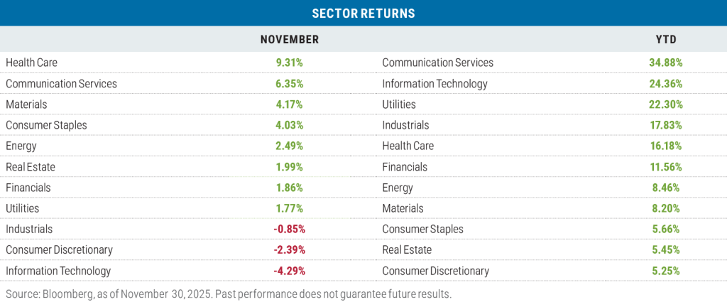 For the second month in a row, we saw strength in the Health Care sector, led primarily by pharmaceutical companies rather than medical device companies or health insurers. Eli Lilly was the top performing stock in the Health Care sector during November with a return of 24.82% and contributed 35% of the sector’s overall return, helped by the success of the company’s Zepbound weight loss drug.