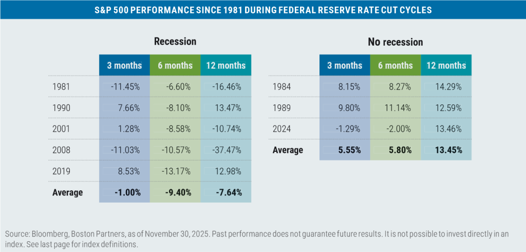As we’ve highlighted before, Fed easing cycles have been a positive for S&P 500 returns as long as a recession is avoided.