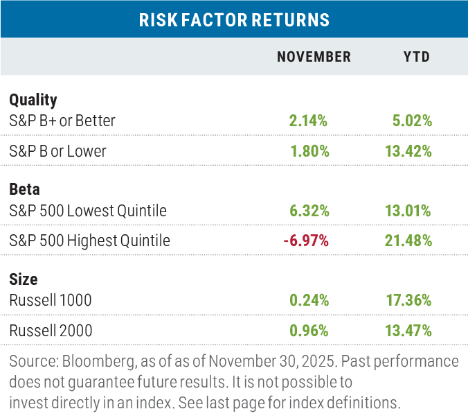 “Risk off” was the major theme in November as high-quality stocks beat low quality and low-beta names outperformed high-beta ones. While the Russell 2000 Index of small-cap stocks outperformed the large-cap Russell 1000 Index by 72 basis points, that was largely due to the profit taking on tech stocks in the large-cap benchmark.