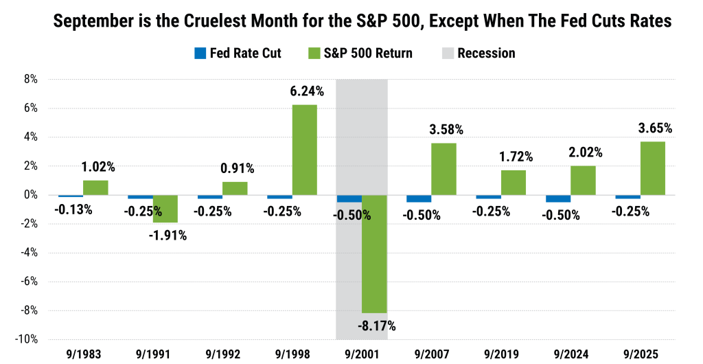 Historically, September has tended to be the worst month of the year for stocks, with losses over the past five, 10, and 20 years. The exception to the rule? When the Fed cuts interest rates in a non-recessionary environment. That’s exactly what happened this past month, and the S&P 500 responded with a 3.65% gain.